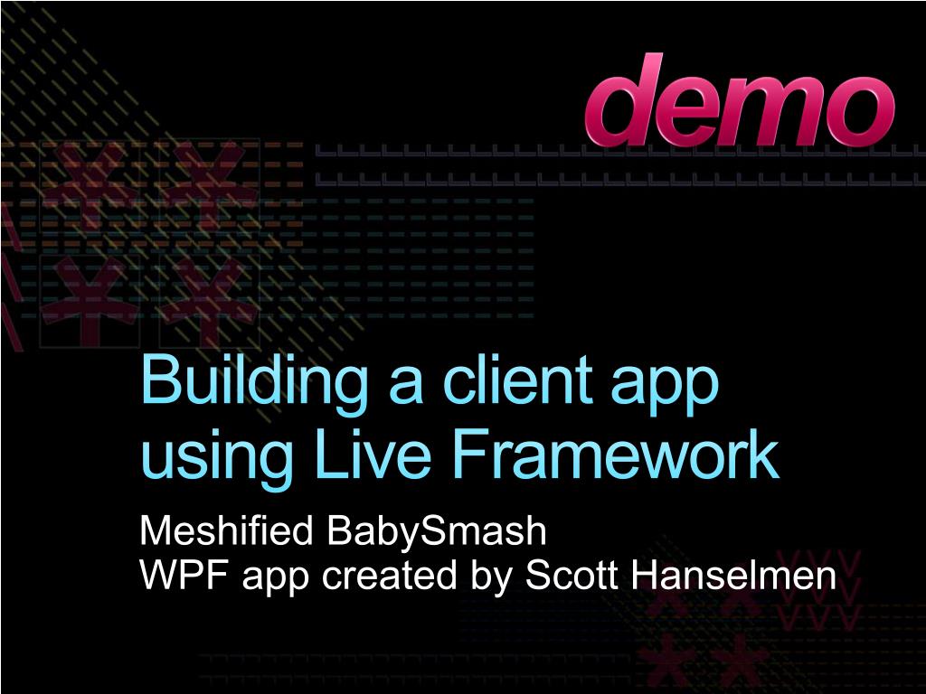 demo Building a client app using Live Framework MeshifiedBabySmashWPF app created by Scott Hanselmen