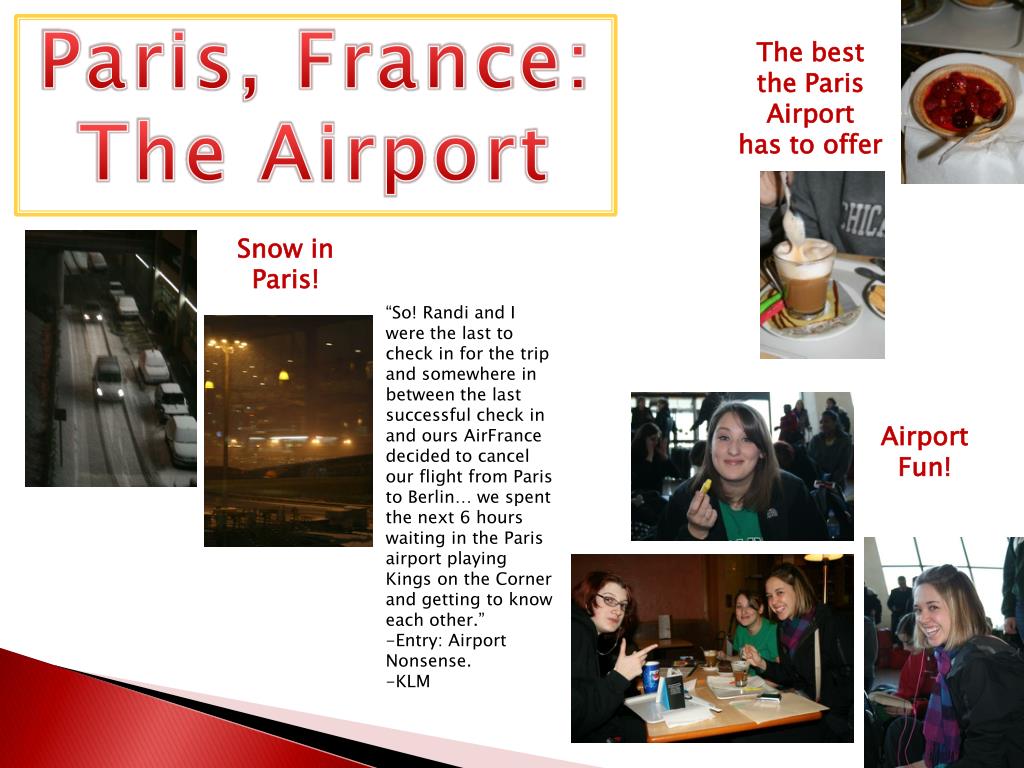 Paris, France: The Airport The best the Paris Airport has to offer Snow in Paris! • “So! Randi and I were the last to check in for the trip and somewhere in between the last successful check in and ours AirFrance decided to cancel our flight from Paris to Berlin… we spent the next 6 hours waiting in the Paris airport playing Kings on the Corner and getting to know each other.” • Entry: Airport Nonsense. • KLM Airport Fun!