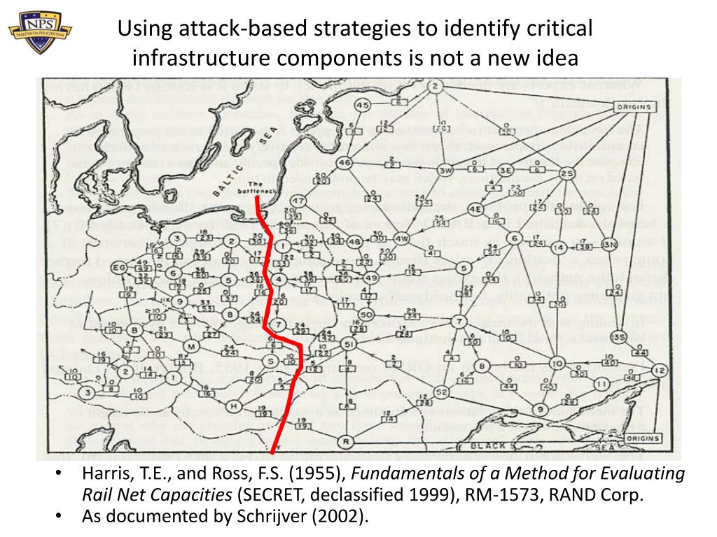 Using attack-based strategies to identify critical infrastructure components is not a new idea • Harris, T.E., and Ross, F.S. (1955), Fundamentals of a Method for Evaluating Rail Net Capacities (SECRET, declassified 1999), RM-1573, RAND Corp. • As documented by Schrijver (2002).