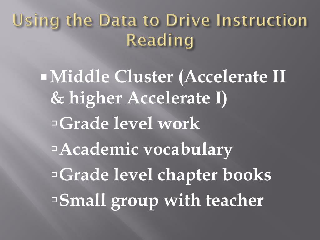 Using the Data to Drive Instruction Reading • Middle Cluster (Accelerate II & higher Accelerate I) • Grade level work • Academic vocabulary • Grade level chapter books • Small group with teacher