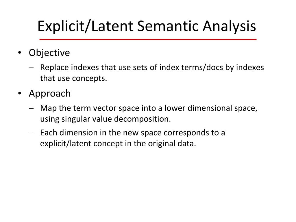 Explicit/Latent Semantic Analysis • Objective • Replace indexes that use sets of index terms/docs by indexes that use concepts. • Approach • Map the term vector space into a lower dimensional space, using singular value decomposition. • Each dimension in the new space corresponds to a explicit/latent concept in the original data.