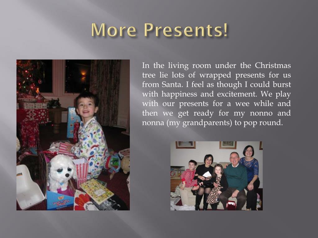 More Presents! In the living room under the Christmas tree lie lots of wrapped presents for us from Santa. I feel as though I could burst with happiness and excitement. We play with our presents for a wee while and then we get ready for my nonno and nonna (my grandparents) to pop round.