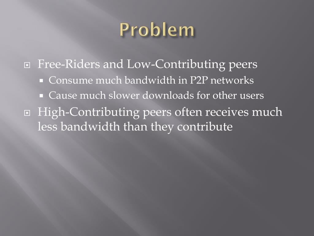 Problem • Free-Riders and Low-Contributing peers • Consume much bandwidth in P2P networks • Cause much slower downloads for other users • High-Contributing peers often receives much less bandwidth than they contribute