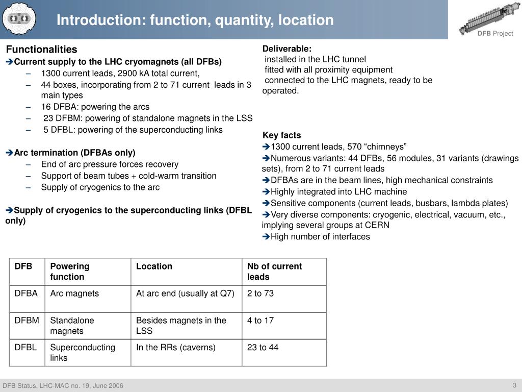 Introduction: main design features Functionalities of the DFBs • 16 x DFBA • 5 x DFBL • 23 x DFBM • Arc termination module (ATM) • Current leads modules