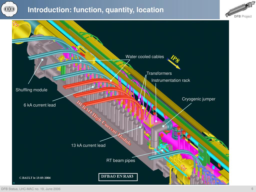 Introduction: function, quantity, location Water cooled cables Transformers Instrumentation rack Shuffling module Cryogenic jumper 6 kA current lead 13 kA current lead RT beam pipes