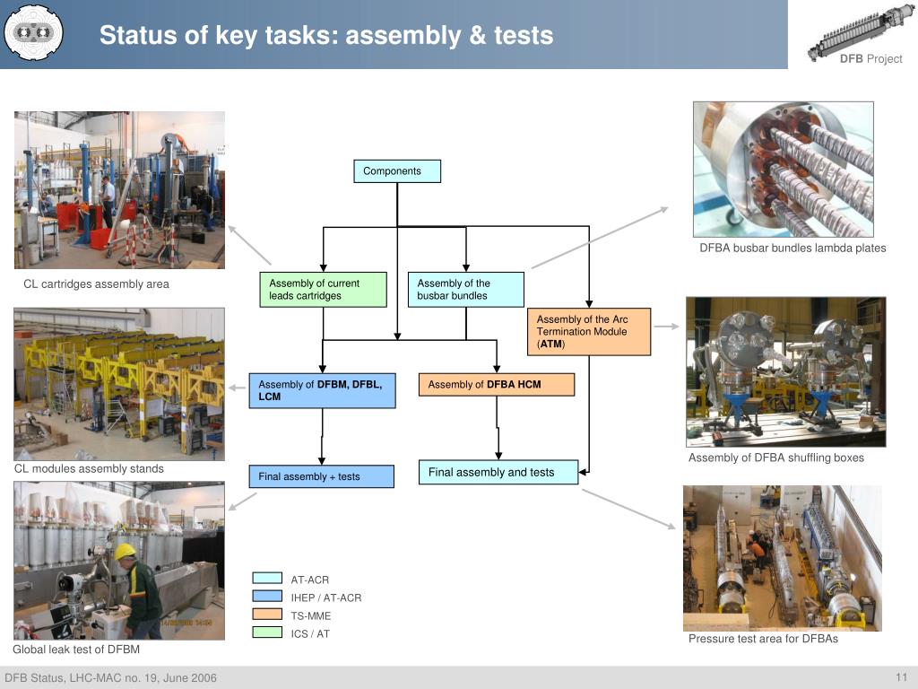 Status of key tasks: assembly & tests Components DFBA busbar bundles lambda plates CL cartridges assembly area Assembly of current leads cartridges Assembly of the busbar bundles Assembly of the Arc Termination Module (ATM) Assembly of DFBM, DFBL, LCM Assembly of DFBA HCM Assembly of DFBA shuffling boxes CL modules assembly stands Final assembly and tests Final assembly + tests AT-ACR IHEP / AT-ACR TS-MME ICS / AT Pressure test area for DFBAs Global leak test of DFBM