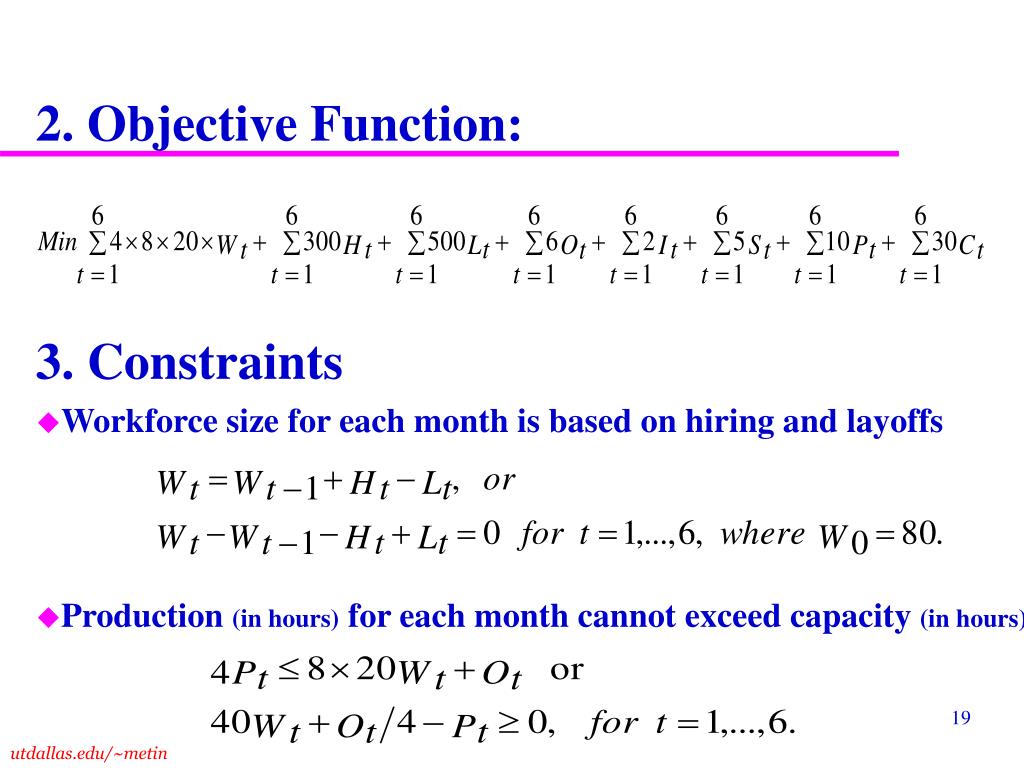2. Objective Function: 3. Constraints • Workforce size for each month is based on hiring and layoffs • Production (in hours) for each month cannot exceed capacity (in hours)