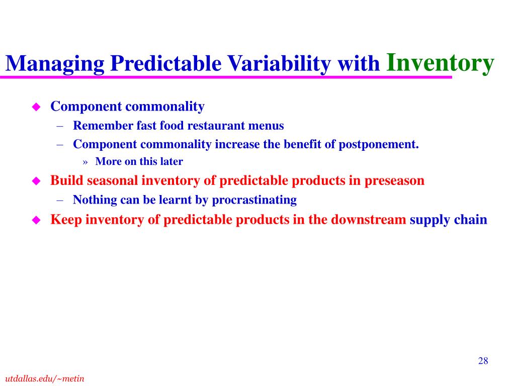 Managing Predictable Variability with Inventory • Component commonality • Remember fast food restaurant menus • Component commonality increase the benefit of postponement. • More on this later • Build seasonal inventory of predictable products in preseason • Nothing can be learnt by procrastinating • Keep inventory of predictable products in the downstream supply chain