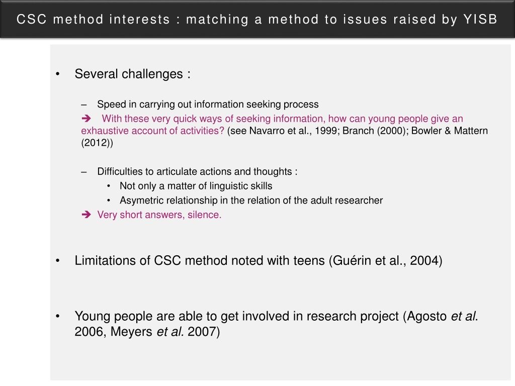 CSC methodinterests : matching a method to issues raised by YISB • Several challenges : • Speed in carrying out information seekingprocess Withthesevery quick ways of seeking information, how canyoung people give an exhaustive account of activities? (see Navarro et al., 1999; Branch (2000); Bowler & Mattern (2012)) • Difficulties to articulate actions and thoughts : • Not only a matter of linguisticskills • Asymetricrelationship in the relation of the adultresearcher • Very short answers, silence. • Limitations of CSC methodnotedwithteens (Guérin et al., 2004) • Young people are able to getinvolved in researchproject (Agostoet al. 2006, Meyerset al. 2007)