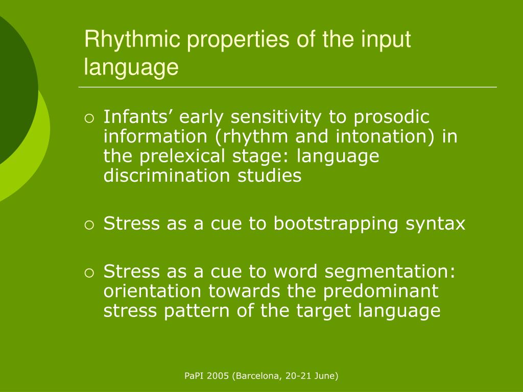Rhythmic properties of the input language • Infants’ early sensitivity to prosodic information (rhythm and intonation) in the prelexical stage: language discrimination studies • Stress as a cue to bootstrapping syntax • Stress as a cue to word segmentation: orientation towards the predominant stress pattern of the target language PaPI 2005 (Barcelona, 20-21 June)