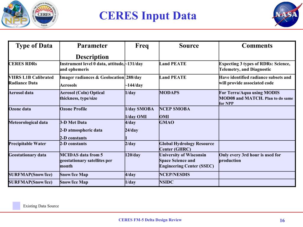 CERES Input Data Existing Data Source CERES FM-5 Delta Design Review