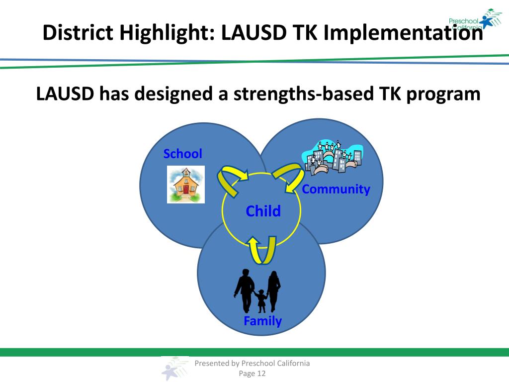 School Community Child Family District Highlight: LAUSD TK Implementation LAUSD has designed a strengths-based TK program Presented by Preschool California Page 12
