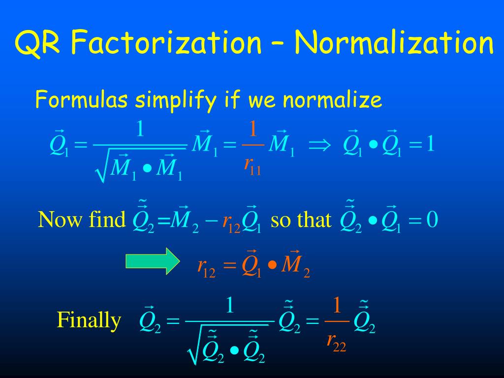 QR Factorization – Key idea If M has orthogonal columns Orthogonal columns implies: Multiplying the weighted columns equation by i-th column: Simplifying using orthogonality: