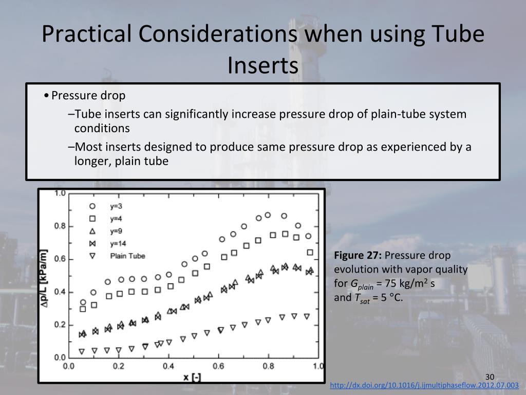 Practical Considerations when using Tube Inserts • Pressure drop • Tube inserts can significantly increase pressure drop of plain-tube system conditions • Most inserts designed to produce same pressure drop as experienced by a longer, plain tube Figure 27: Pressure drop evolution with vapor quality for Gplain = 75 kg/m2 s and Tsat = 5 °C. http://dx.doi.org/10.1016/j.ijmultiphaseflow.2012.07.003