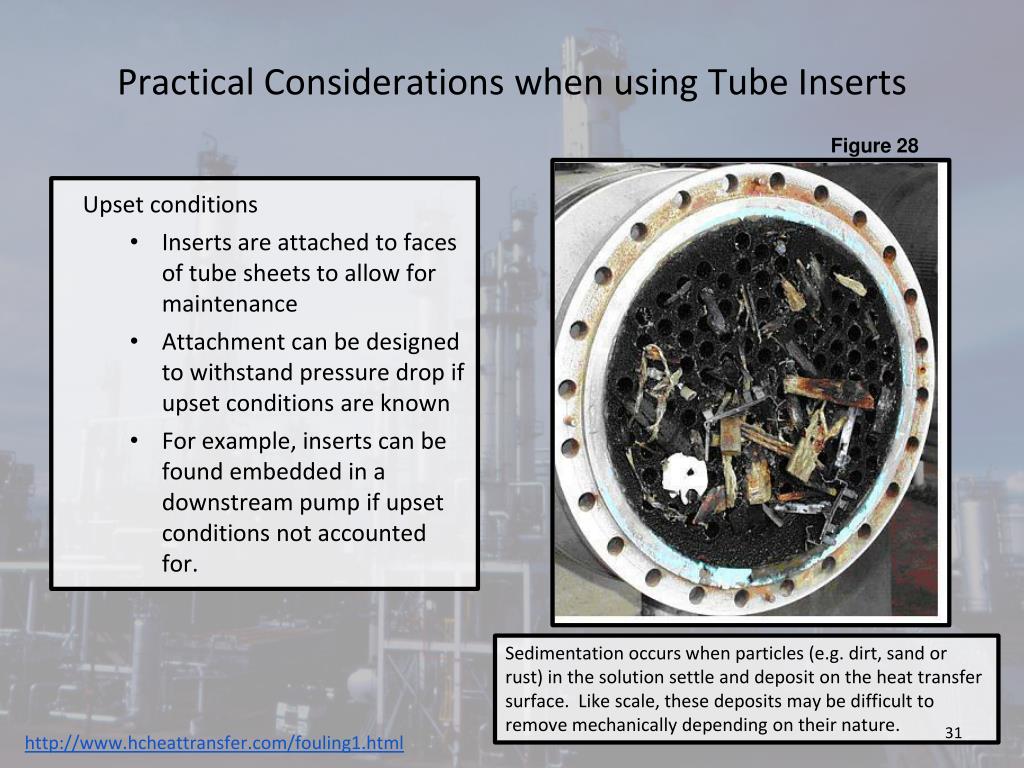 Upset conditions Inserts are attached to faces of tube sheets to allow for maintenance Attachment can be designed to withstand pressure drop if upset conditions are known For example, inserts can be found embedded in a downstream pump if upset conditions not accounted for. Practical Considerations when using Tube Inserts Figure 28 Sedimentation occurs when particles (e.g. dirt, sand or rust) in the solution settle and deposit on the heat transfer surface. Like scale, these deposits may be difficult to remove mechanically depending on their nature. http://www.hcheattransfer.com/fouling1.html