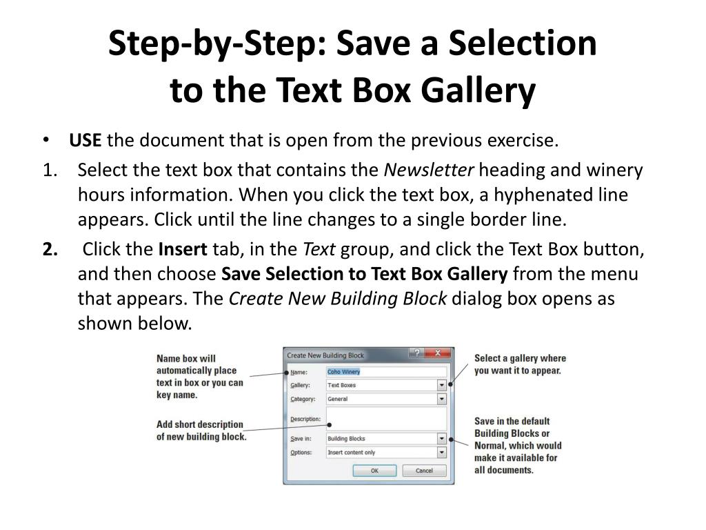 Step-by-Step: Save a Selection to the Text Box Gallery • USEthe document that is open from the previous exercise. • Select the text box that contains the Newsletter heading and winery hours information. When you click the text box, a hyphenated line appears. Click until the line changes to a single border line. • Click the Insert tab, in the Text group, and click the Text Box button, and then choose Save Selection to Text Box Gallery from the menu that appears. The Create New Building Block dialog box opens as shown below.