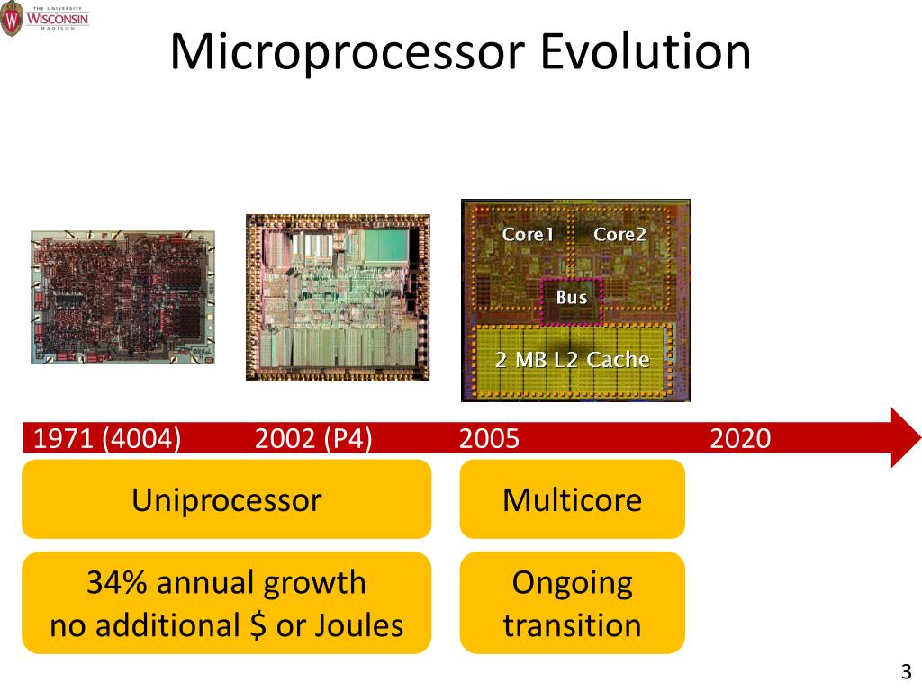 Microprocessor Evolution 1971 (4004) 2002 (P4) Uniprocessor Several techniques invented @ UW Sohi, Smith, Goodman, Hill, Wood 34% annual growth no additional $ or Joules