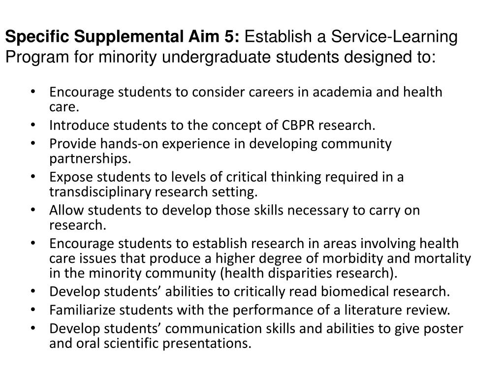 Specific Supplemental Aim 5: Establish a Service-Learning Program for minority undergraduate students designed to: • Encourage students to consider careers in academia and health care. • Introduce students to the concept of CBPR research. • Provide hands-on experience in developing community partnerships. • Expose students to levels of critical thinking required in a transdisciplinary research setting. • Allow students to develop those skills necessary to carry on research. • Encourage students to establish research in areas involving health care issues that produce a higher degree of morbidity and mortality in the minority community (health disparities research). • Develop students’ abilities to critically read biomedical research. • Familiarize students with the performance of a literature review. • Develop students’ communication skills and abilities to give poster and oral scientific presentations.