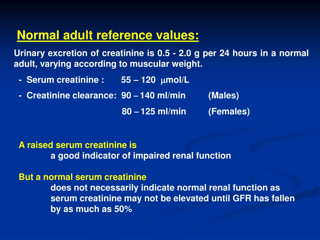 Normal adult reference values: Urinary excretion of creatinine is 0.5 - 2.0 g per 24 hours in a normal adult, varying according to muscular weight. - Serum creatinine : 55 – 120 mol/L - Creatinine clearance: 90 –140 ml/min (Males) 80 –125 ml/min (Females) A raised serum creatinine is a good indicator of impaired renal function But a normal serum creatinine does not necessarily indicate normal renal function as serum creatinine may not be elevated until GFR has fallen by as much as 50%