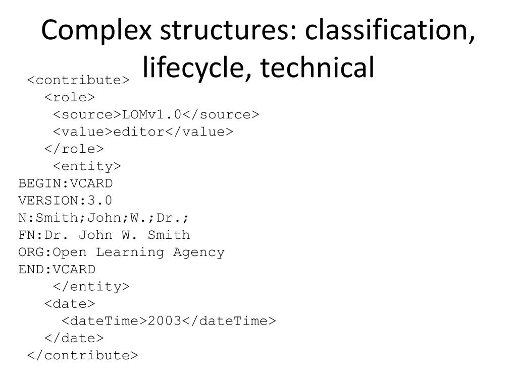 Complex structures: classification, lifecycle, technical <contribute> <role> <source>LOMv1.0</source> <value>editor</value> </role> <entity> BEGIN:VCARD VERSION:3.0 N:Smith;John;W.;Dr.; FN:Dr. John W. Smith ORG:Open Learning Agency END:VCARD </entity> <date> <dateTime>2003</dateTime> </date> </contribute>