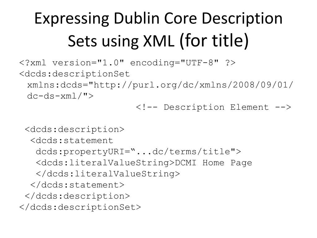 Expressing Dublin Core Description Sets using XML(for title) <?xml version="1.0" encoding="UTF-8" ?> <dcds:descriptionSet xmlns:dcds="http://purl.org/dc/xmlns/2008/09/01/dc-ds-xml/"> <!-- Description Element --> <dcds:description> <dcds:statement dcds:propertyURI=“...dc/terms/title"> <dcds:literalValueString>DCMI Home Page </dcds:literalValueString> </dcds:statement> </dcds:description> </dcds:descriptionSet>
