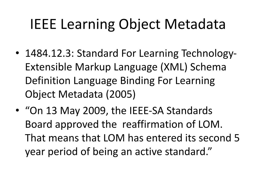 IEEE Learning Object Metadata • 1484.12.3: Standard For Learning Technology-Extensible Markup Language (XML) Schema Definition Language Binding For Learning Object Metadata (2005) • “On 13 May 2009, the IEEE-SA Standards Board approved the reaffirmation of LOM. That means that LOM has entered its second 5 year period of being an active standard.”