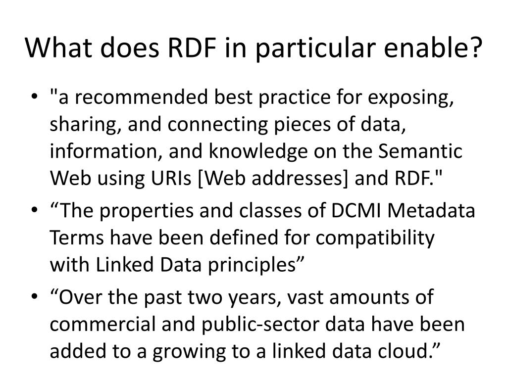 What does RDF in particular enable? • "a recommended best practice for exposing, sharing, and connecting pieces of data, information, and knowledge on the Semantic Web using URIs [Web addresses] and RDF." • “The properties and classes of DCMI Metadata Terms have been defined for compatibility with Linked Data principles” • “Over the past two years, vast amounts of commercial and public-sector data have been added to a growing to a linked data cloud.”