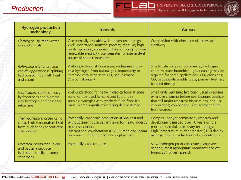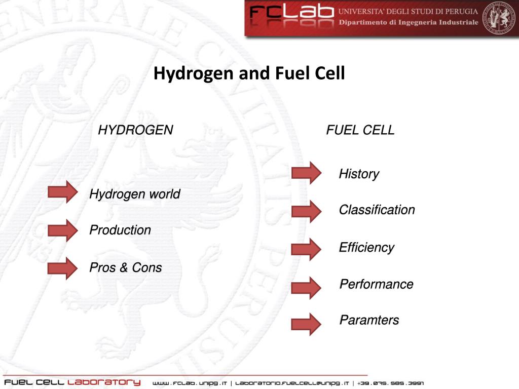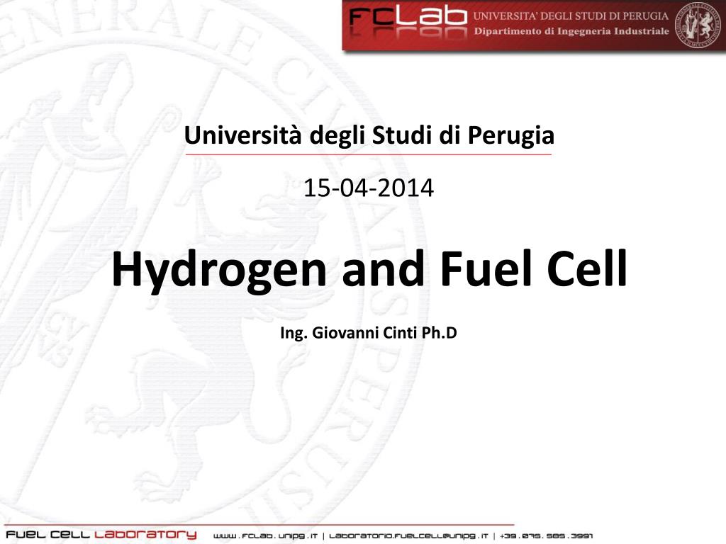 Università degli Studi di Perugia. 15-04-2014. Hydrogen and Fuel Cell. Ing. Giovanni Cinti Ph .D. Hydrogen and Fuel Cell. HYDROGEN. FUEL CELL. History. Hydrogen world . Classification. Production. Efficiency. Pros & Cons. Performance. Paramters.