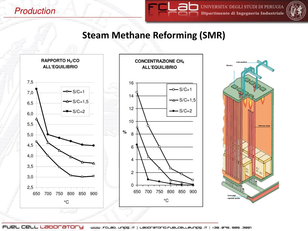 Production Il gas naturale è la fonte principale nella produzione di H2 e solitamente il processo che lo trasforma in syngas (miscela di CO e H2) è il reforming con vapore. Le reazioni fondamentali che avvengono in uno SMR sono: SteamMethaneReforming (SMR) Reforming idrocarburi endotermiche Reforming del metano CO-Shift