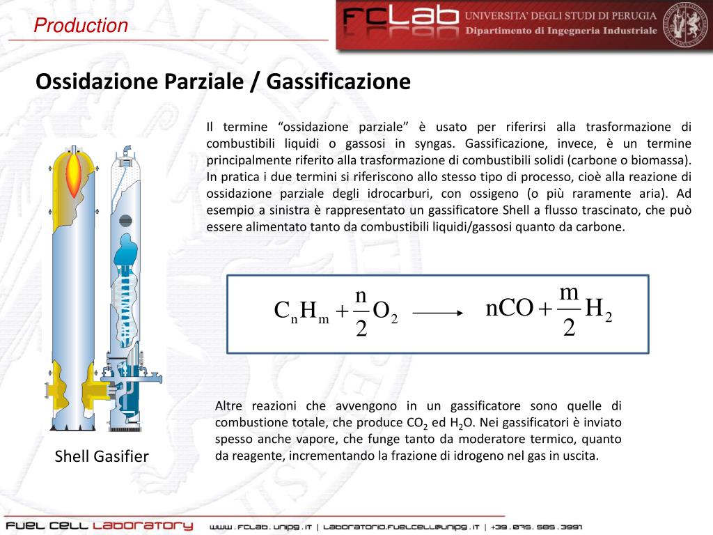 Production Ossidazione Parziale / Gassificazione Il termine “ossidazione parziale” è usato per riferirsi alla trasformazione di combustibili liquidi o gassosi in syngas. Gassificazione, invece, è un termine principalmente riferito alla trasformazione di combustibili solidi (carbone o biomassa). In pratica i due termini si riferiscono allo stesso tipo di processo, cioè alla reazione di ossidazione parziale degli idrocarburi, con ossigeno (o più raramente aria). Ad esempio a sinistra è rappresentato un gassificatoreShell a flusso trascinato, che può essere alimentato tanto da combustibili liquidi/gassosi quanto da carbone. Altre reazioni che avvengono in un gassificatore sono quelle di combustione totale, che produce CO2 ed H2O. Nei gassificatori è inviato spesso anche vapore, che funge tanto da moderatore termico, quanto da reagente, incrementando la frazione di idrogeno nel gas in uscita. ShellGasifier