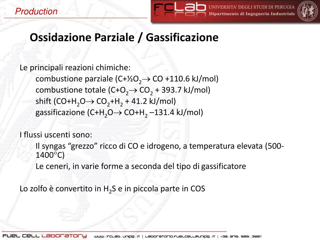 Production Ossidazione Parziale / Gassificazione • Le principali reazioni chimiche: • combustione parziale (C+½O2 CO +110.6 kJ/mol) • combustione totale (C+O2 CO2 + 393.7 kJ/mol) • shift (CO+H2O CO2+H2 + 41.2 kJ/mol) • gassificazione (C+H2O CO+H2 –131.4 kJ/mol) • I flussi uscenti sono: • Il syngas “grezzo” ricco di CO e idrogeno, a temperatura elevata (500-1400°C) • Le ceneri, in varie forme a seconda del tipo di gassificatore • Lo zolfo è convertito in H2S e in piccola parte in COS