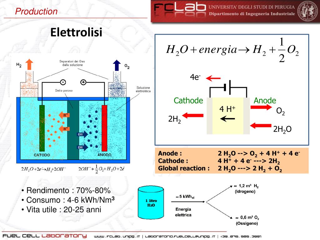 4e- Cathode Anode 4 H+ O2 2H2 2H2O Production Elettrolisi Anode : 2 H2O --> O2 + 4 H+ + 4 e- Cathode : 4 H+ + 4 e- ---> 2H2 Global reaction : 2 H2O ---> 2 H2 + O2 • Rendimento : 70%-80% • Consumo : 4-6 kWh/Nm3 • Vita utile : 20-25 anni