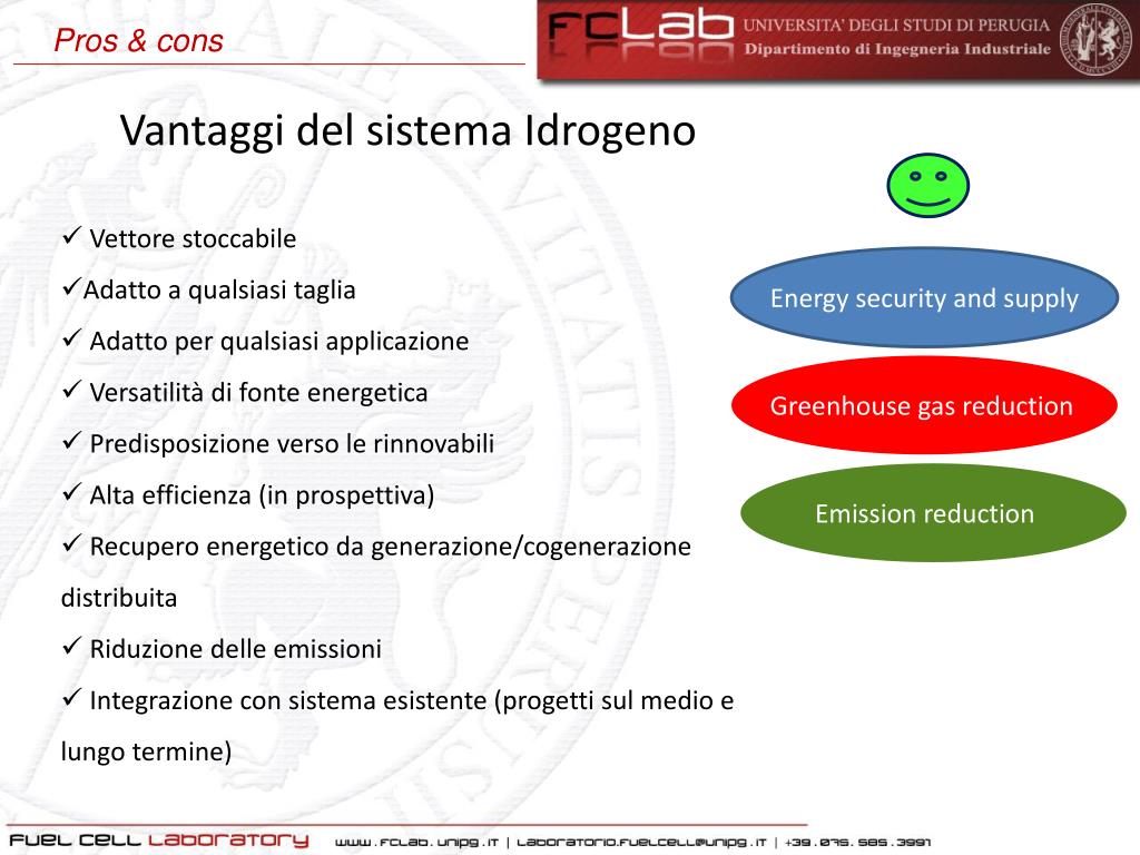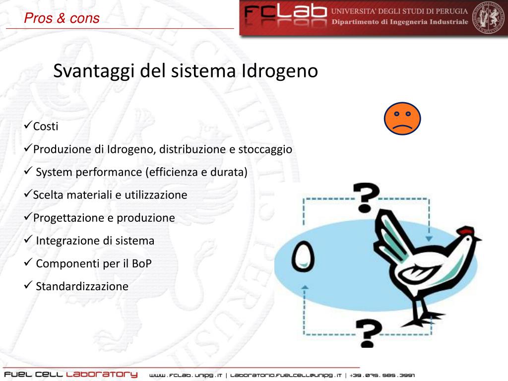 Pros & cons • Svantaggidel sistemaIdrogeno • Costi • Produzione di Idrogeno, distribuzione e stoccaggio • System performance (efficienza e durata) • Scelta materiali e utilizzazione • Progettazione e produzione • Integrazione di sistema • Componenti per il BoP • Standardizzazione