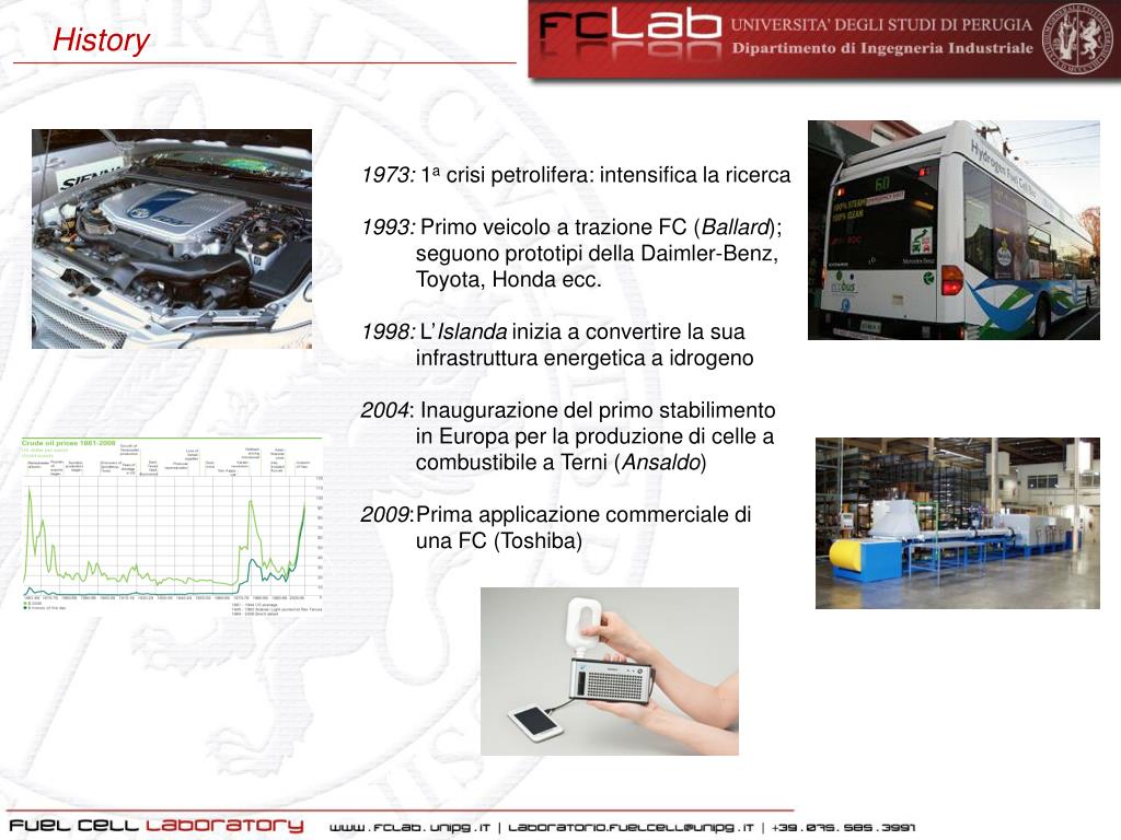 History 1973: 1acrisipetrolifera: intensifica la ricerca 1993: Primo veicolo a trazione FC (Ballard); seguonoprototipidella Daimler-Benz, Toyota, Honda ecc. 1998:L’Islandainizia a convertire la suainfrastrutturaenergetica a idrogeno 2004: Inaugurazione del primo stabilimento in Europa per la produzione di celle a combustibile a Terni (Ansaldo) 2009: Prima applicazione commerciale di una FC (Toshiba)
