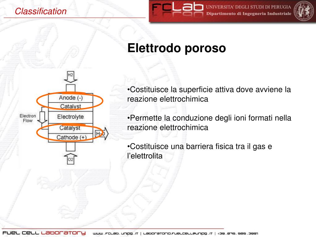 Classification • Elettrodo poroso • Costituisce la superficie attiva dove avviene la reazione elettrochimica • Permette la conduzione degli ioni formati nella reazione elettrochimica • Costituisce una barriera fisica tra il gas e l’elettrolita
