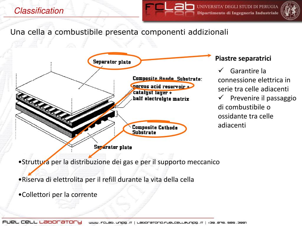 Struttura per la distribuzione dei gas e per il supporto meccanico • Riserva di elettrolita per il refill durante la vita della cella Classification Una cella a combustibile presenta componenti addizionali • Piastre separatrici • Garantire la connessione elettrica in serie tra celle adiacenti • Prevenire il passaggio di combustibile o ossidante tra celle adiacenti • Collettori per la corrente