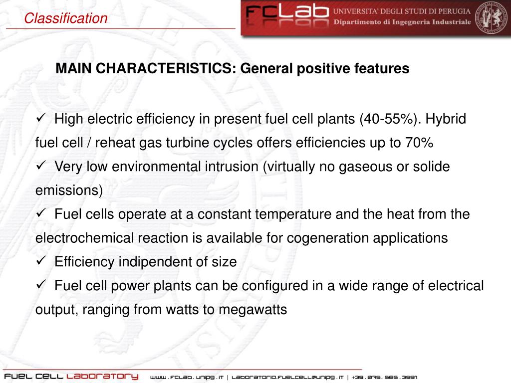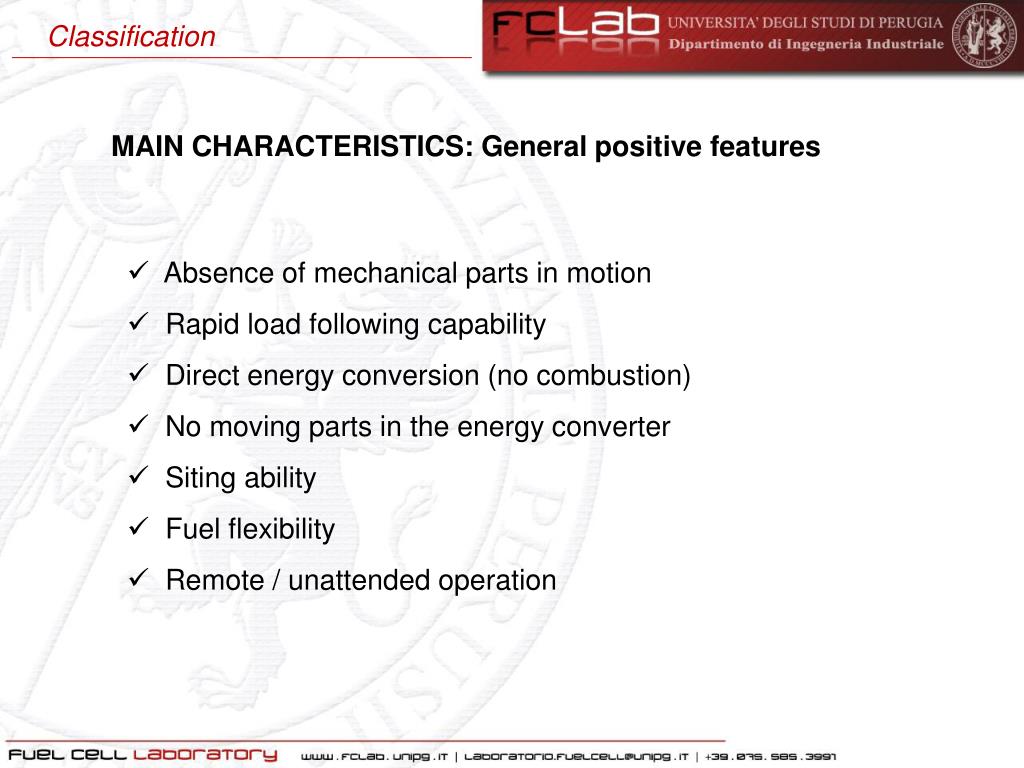 Classification MAIN CHARACTERISTICS: General positive features • Absenceofmechanicalparts in motion • Rapidloadfollowingcapability • Directenergyconversion (no combustion) • No movingparts in the energyconverter • Sitingability • Fuelflexibility • Remote / unattendedoperation