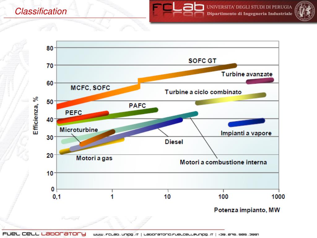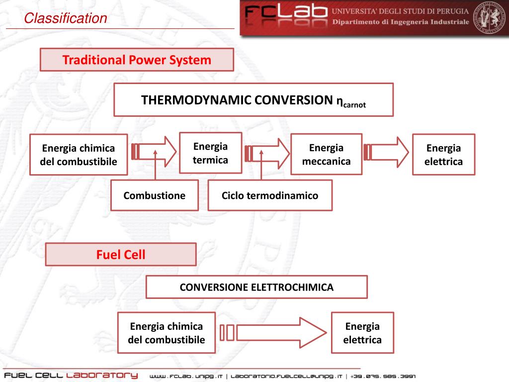 Classification Traditional Power System THERMODYNAMIC CONVERSIONηcarnot Energia termica Energia meccanica Energia elettrica Energia chimica del combustibile Combustione Ciclo termodinamico Fuel Cell CONVERSIONE ELETTROCHIMICA Energia chimica del combustibile Energia elettrica