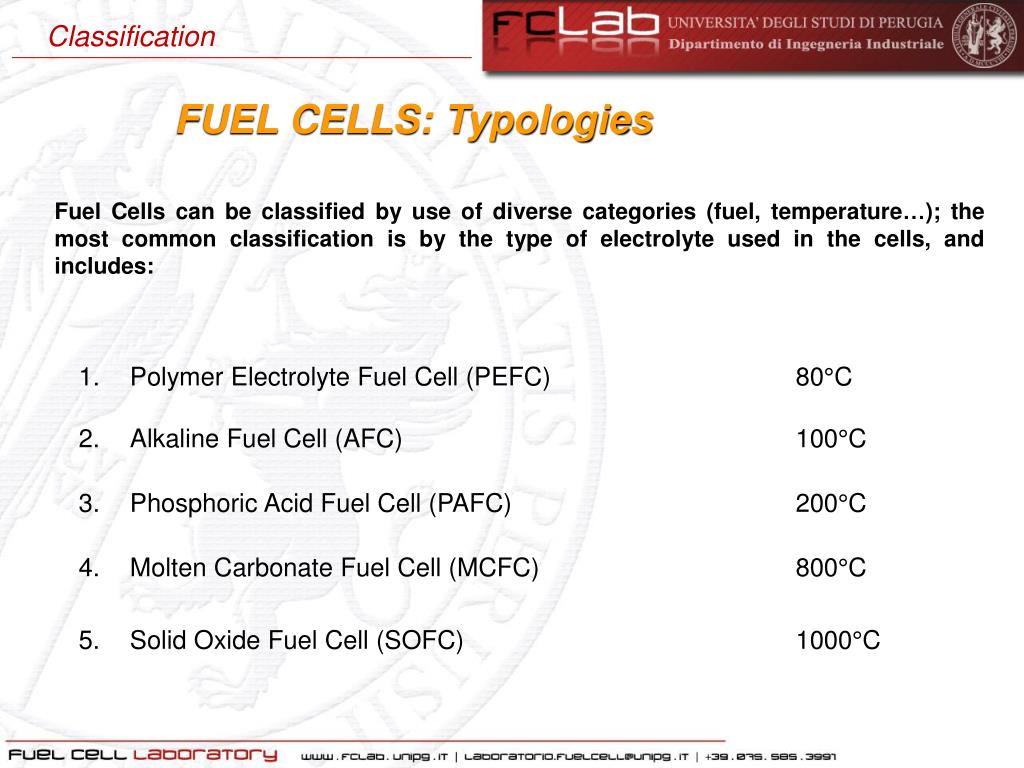 Classification FUEL CELLS: Typologies Fuel Cells can be classified by use of diverse categories (fuel, temperature…); the most common classification is by the type of electrolyte used in the cells, and includes: PolymerElectrolyteFuel Cell (PEFC) 80°C Alkaline Fuel Cell (AFC) 100°C Phosphoric Acid Fuel Cell (PAFC) 200°C Molten Carbonate Fuel Cell (MCFC) 800°C SolidOxideFuel Cell (SOFC) 1000°C