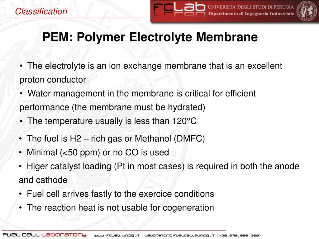 Classification PEM: Polymer Electrolyte Membrane • The electrolyteisanionexchange membrane thatisanexcellentproton conductor • Water management in the membrane iscriticalforefficient performance (the membrane mustbehydrated) • The temperature usuallyislessthan 120°C • The fuelis H2 – richgas or Methanol (DMFC) • Minimal (<50 ppm) or no CO isused • Higercatalystloading (Pt in mostcases) isrequired in both the anode and cathode • Fuel cell arrivesfastlyto the exerciceconditions • The reactionheatisnotusableforcogeneration