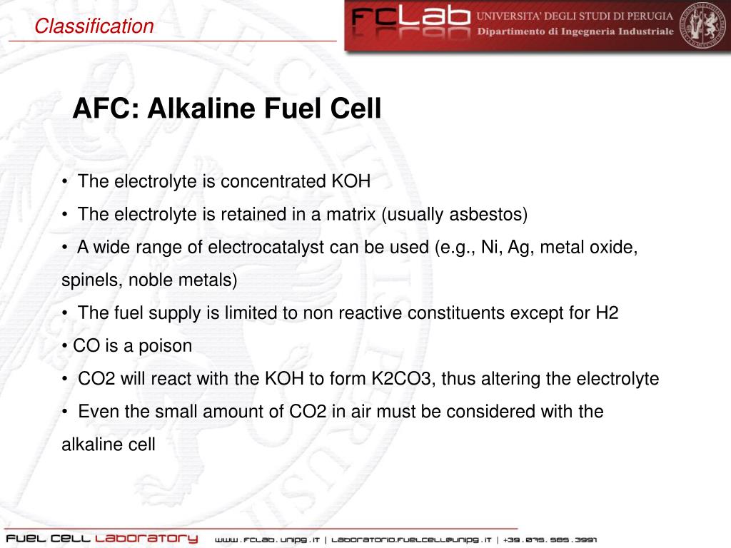 Classification AFC: Alkaline Fuel Cell • The electrolyteisconcentrated KOH • The electrolyteisretained in a matrix (usuallyasbestos) • A wide rangeofelectrocatalyst can beused (e.g., Ni, Ag, metal oxide, spinels, noblemetals) • The fuelsupplyislimited to non reactiveconstituentsexcept for H2 • CO is a poison • CO2 willreact with the KOH to form K2CO3, thusaltering the electrolyte • Even the small amount of CO2 in air must be considered with the alkalinecell