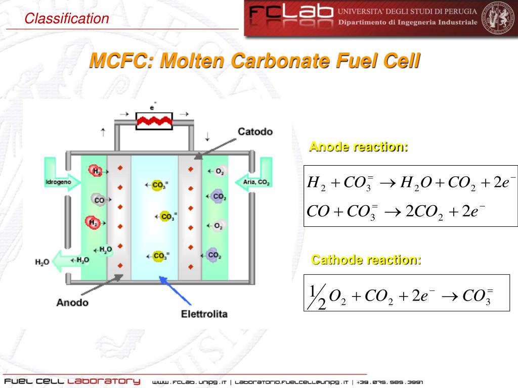 Classification MCFC: Molten Carbonate Fuel Cell Anode reaction: Cathode reaction:
