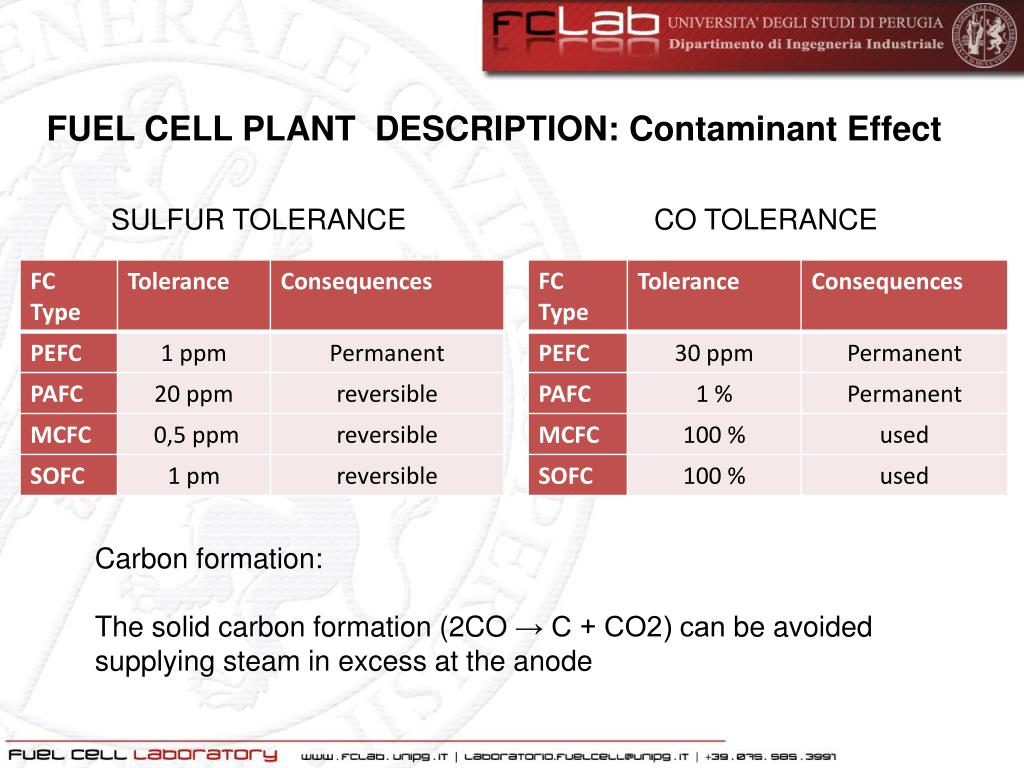 FUEL CELL PLANT DESCRIPTION: Contaminant Effect SULFUR TOLERANCE CO TOLERANCE Carbonformation: The solidcarbonformation (2CO → C + CO2) can beavoidedsupplyingsteam in excess at the anode
