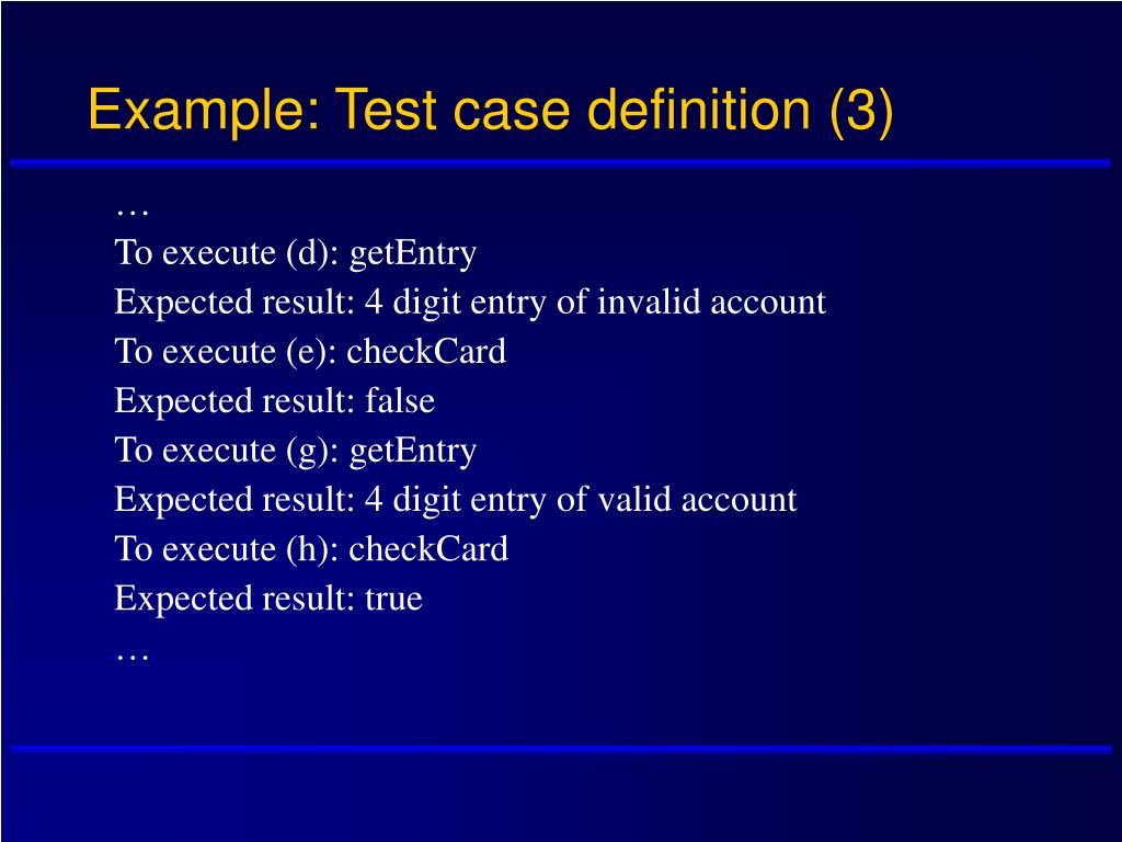 Example: Test case definition (3) … To execute (d): getEntry Expected result: 4 digit entry of invalid account To execute (e): checkCard Expected result: false To execute (g): getEntry Expected result: 4 digit entry of valid account To execute (h): checkCard Expected result: true …