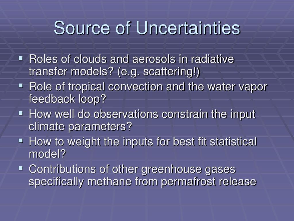 Source of Uncertainties • Roles of clouds and aerosols in radiative transfer models? (e.g. scattering!) • Role of tropical convection and the water vapor feedback loop? • How well do observations constrain the input climate parameters? • How to weight the inputs for best fit statistical model? • Contributions of other greenhouse gases specifically methane from permafrost release