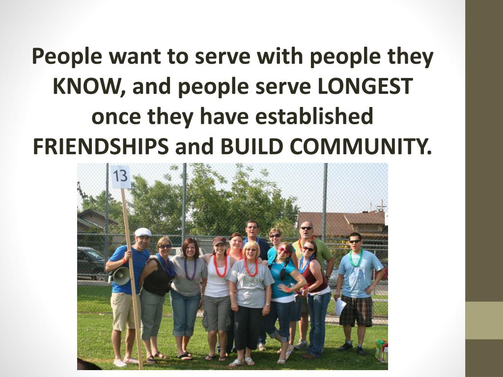 People want to serve with people they KNOW, and people serve LONGEST once they have established FRIENDSHIPS and BUILD COMMUNITY.