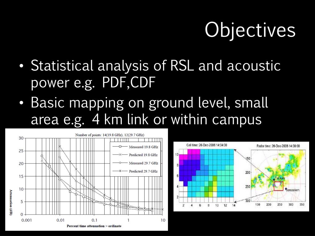 Objectives • Statistical analysis of RSL and acoustic power e.g. PDF,CDF • Basic mapping on ground level, small area e.g. 4 km link or within campus