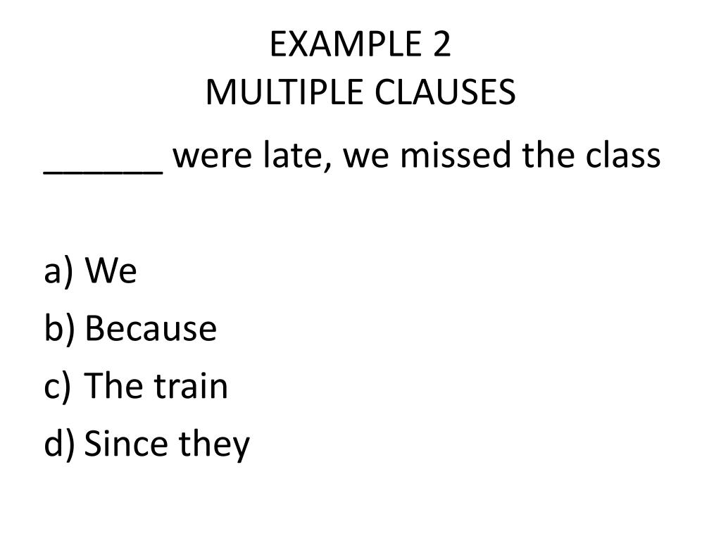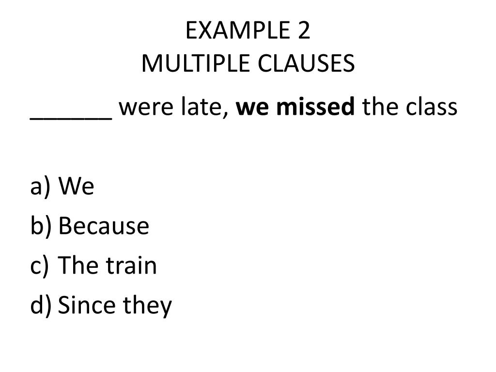 EXAMPLE 2MULTIPLE CLAUSES ______ were late, we missed the class • We • Because • The train • Since they