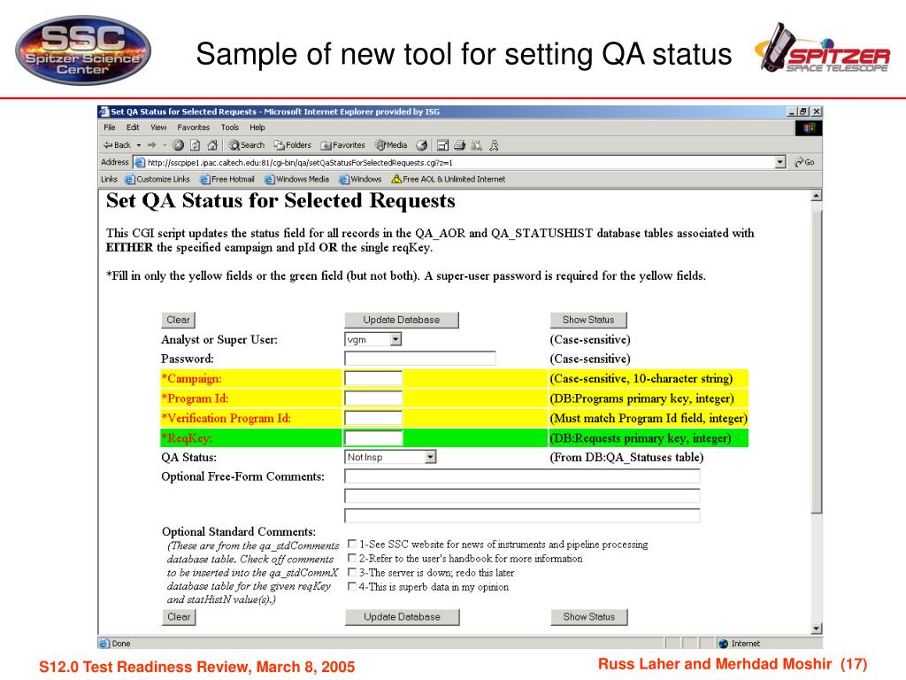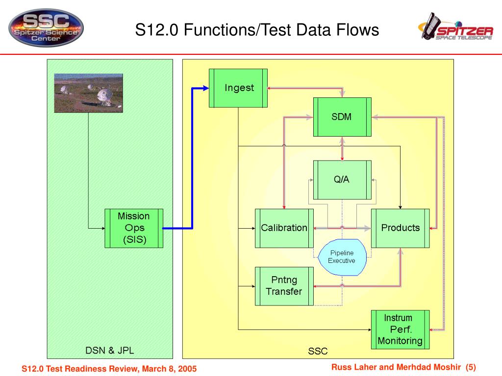 S12.0 Success Criteria • Run, re-run requests that failed on OPS • Interact with the SODB via perl & c-APIs • Deposit raw data into the archive file system • Create pipeline manifests & ensembles • Run manifests through APES • Run multiple jobbers on 12 pipeline drones • Use CDF to get configuration files • Use CalTransfer to get calibration data (NIT and/or fallbacks) • Execute post-BCD pipelines including pointing refinemnet • Put QA statistics into QA tables • Put processing results in sandbox and set file pointers in DB • Use SDAT to access and view results on segment test • Get “better” BCDs & post-BCD prods • IST sci verification of seg test data & buy off (incremental from IOC) • Pass the running of archiver