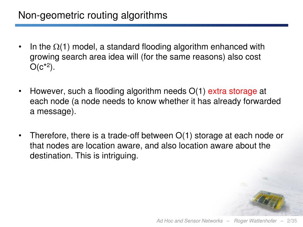 Non-geometric routing algorithms • In the (1) model, a standard flooding algorithm enhanced with growing search area idea will (for the same reasons) also cost O(c*2). • However, such a flooding algorithm needs O(1) extra storage at each node (a node needs to know whether it has already forwarded a message). • Therefore, there is a trade-off between O(1) storage at each node or that nodes are location aware, and also location aware about the destination. This is intriguing.